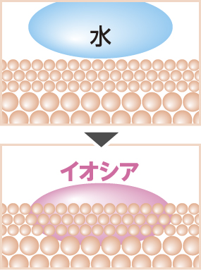 水の表面張力は72mN/m(25℃)に対し、「イオシア」の表面張力は62mN/m(25℃)しかないため、肌に馴染みやすく、また浸透圧が適度に高いため、皮膚に満ち溢れるうるおいを与えます。