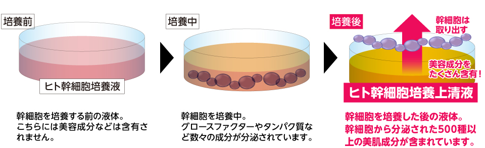 「ヒト幹細胞培養上清液」とは、幹細胞を培養して細胞の数を増やした後の溶液です。